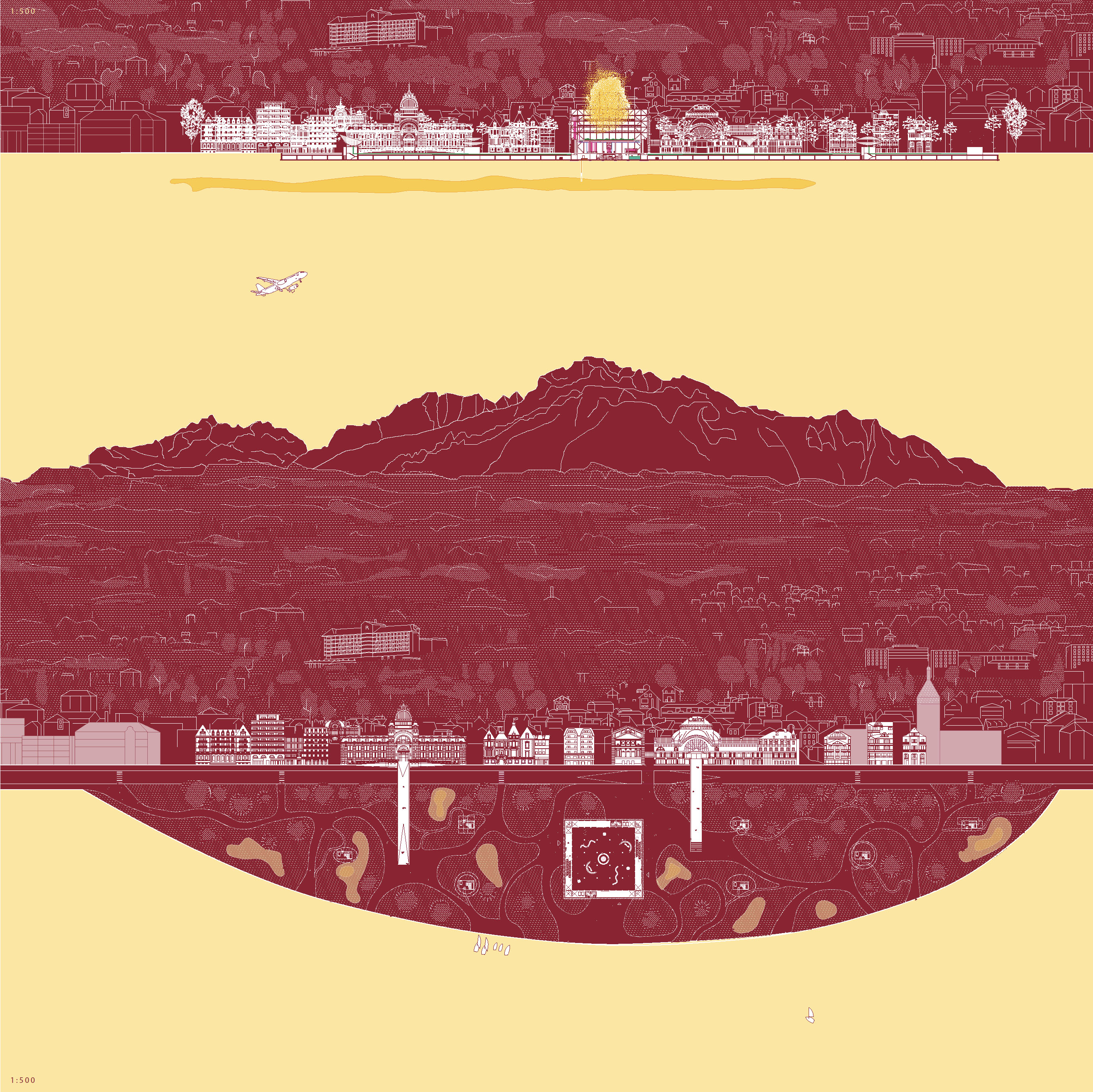 Le front du lac dessine la mise en scène de la ville, sa volonté de rayonner au-delà de ses limites, de s’affranchir des frontières. Au-devant de la scène, un sol artificiel a peu à peu gagné sur l’eau, coupant toute relation directe entre la ville et le lac. Il faudra s’emparer de cet espace d’entre-deux, sans identité, n’appartenant ni à l’un, ni à l’autre, pour le requalifier. L’eau est le principal thème. Se mettant en scène, l’eau minérale, l’eau de pluie, l’eau du lac et l’eau de distribution publique seront les acteurs d’un spectacle liquide, éphémère et sophistiqué, auquel les spectateurs pourront prendre part. Le bâtiment se proclame symbole de la ville. Il offre une scène de prédilection, où la transparence révèle explicitement tous les mécanismes de la mise en scène de l’eau.