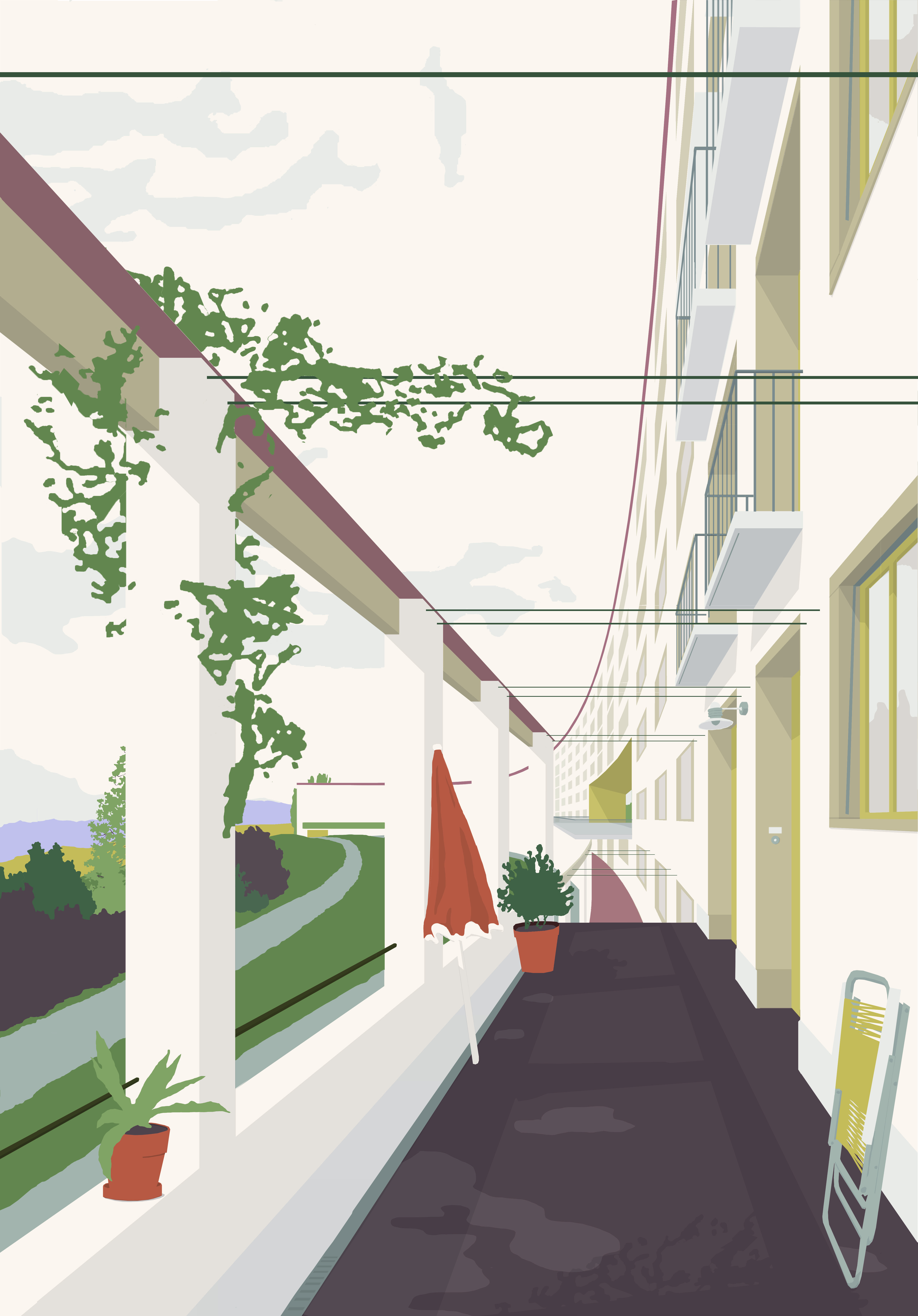 Abritant 350 appartements et une variété d’activités au rez-de-chaussée, le bâtiment est régi par une trame stricte, enrichie d’une série de dispositifs: coursive, balcon, arcade et passage. C’est de la rencontre de ces quelques thèmes avec la topographie qu’émerge une richesse typologique.