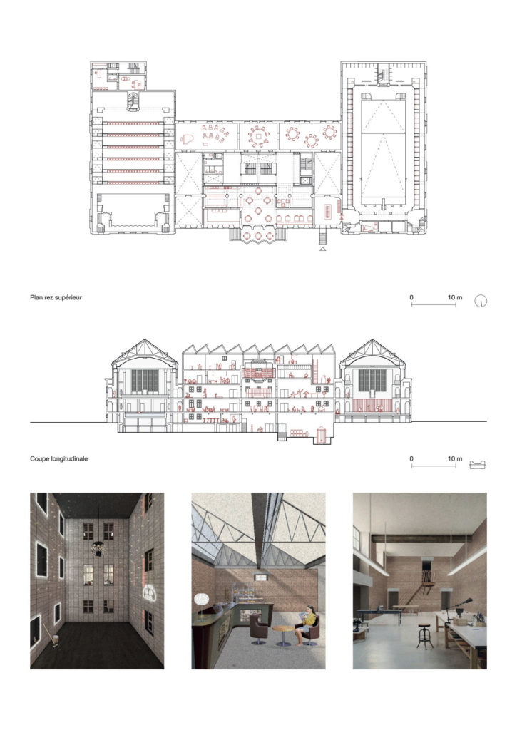 Cette structure, servant de coulisses techniques, permet de réactiver les pièces en périphérie en de nouvelles scènes, afin de mettre en valeur leurs atmosphères et spatialités particulières. Elles sont ensuite investies par les programmes désirés par les voisins : une des piscines retrouve son usage premier quand la seconde se transforme en théâtre, l’ancienne salle des machines devient un atelier communautaire et les associations locales peuvent investir de nouveaux espaces de travail collectifs.